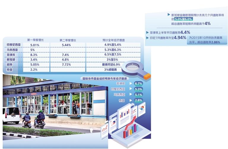 目前,东盟主要经济体通胀压力有所增加。新加坡金融管理局预计未来几个月的通胀率会有所上升,达到5.0%至6.0%,核心通胀率在短期内将略高于4%。今年上半年菲律宾平均通胀率为4.4%,超过央行2%至4%的目标区间。印尼7月份通胀率升至4.94%,为2015年10月份以来的最高水平,核心通胀率为2.86%。