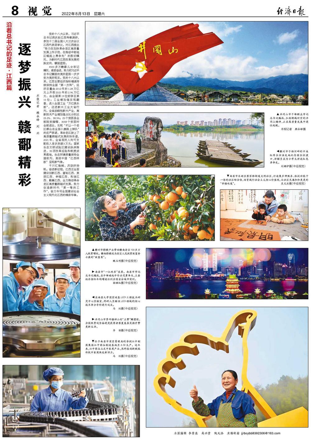 4500多万赣鄱儿女牢记嘱托、感恩奋进,努力把习近平总书记擘画的美好蓝图一步步变为美好现实。党的十八大以来,江西主要经济指标增速持续保持全国“第一方阵”,经济总量由2012年的1.28万亿元上升到2021年的2.96万亿元,由全国第19位前移至第15位;工业增加值实现翻番,进入全国工业“万亿俱乐部”,迈进新兴工业大省行列,全省战略性新兴产业、高新技术产业增加值占比分别达23.2%、38.5%;25个贫困县全部脱贫摘帽、3058个贫困村全部退出,兑现“不让一个老区群众在全面小康路上掉队”的庄严承诺,革命老区驶上了高质量跨越式发展的快车道,2021年,全省居民人均可支配收入首次突破3万元;国家生态文明试验区建设纵深推进,35项改革经验和制度成果落地,生态环境质量保持全国前列,美丽中国“江西样板”呈现新气象。