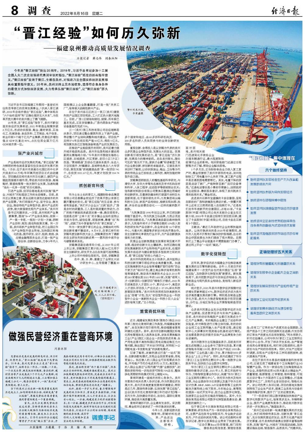 民营企业创新氛围愈发浓厚的背后离不开长期、稳定的创新文化土壤滋养。如何正确处理好发展高新技术产业和传统产业的关系,处理好发展市场经济与建设新型服务型政府之间的关系,是“晋江经验”的核心内涵之一。