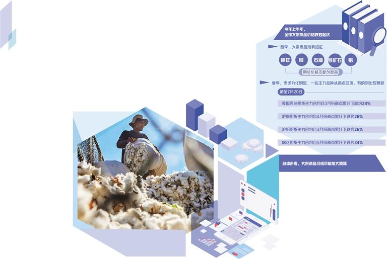 从市场表现看,今年开春大宗商品涨势如虹,棉花、铜、石油、铁矿石、铝等期货价格不断创出新高。进入夏天,商品市场分化明显,一些主力品种从高点回落,有的则出现暴跌。截至7月20日的数据显示,美国原油期货主力合约自3月份高点累计下跌约24%;沪铜期货主力合约自4月份高点累计下跌约26%;沪铝期货主力合约自3月份高点累计下跌约26%;棉花期货主力合约自5月份高点累计下跌约34%。