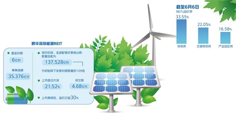 据悉,“鹏华深圳能源REIT”基金份额为6亿份,募集规模为35.376亿元。询价阶段,全部配售对象拟认购数量总和为137.528亿份,为初始网下发售份额数量的109倍。上市首日鹏华深圳能源REIT大涨21.52%,成交额达4.68亿元;上市两周后,鹏华深圳能源REIT溢价已超30%。