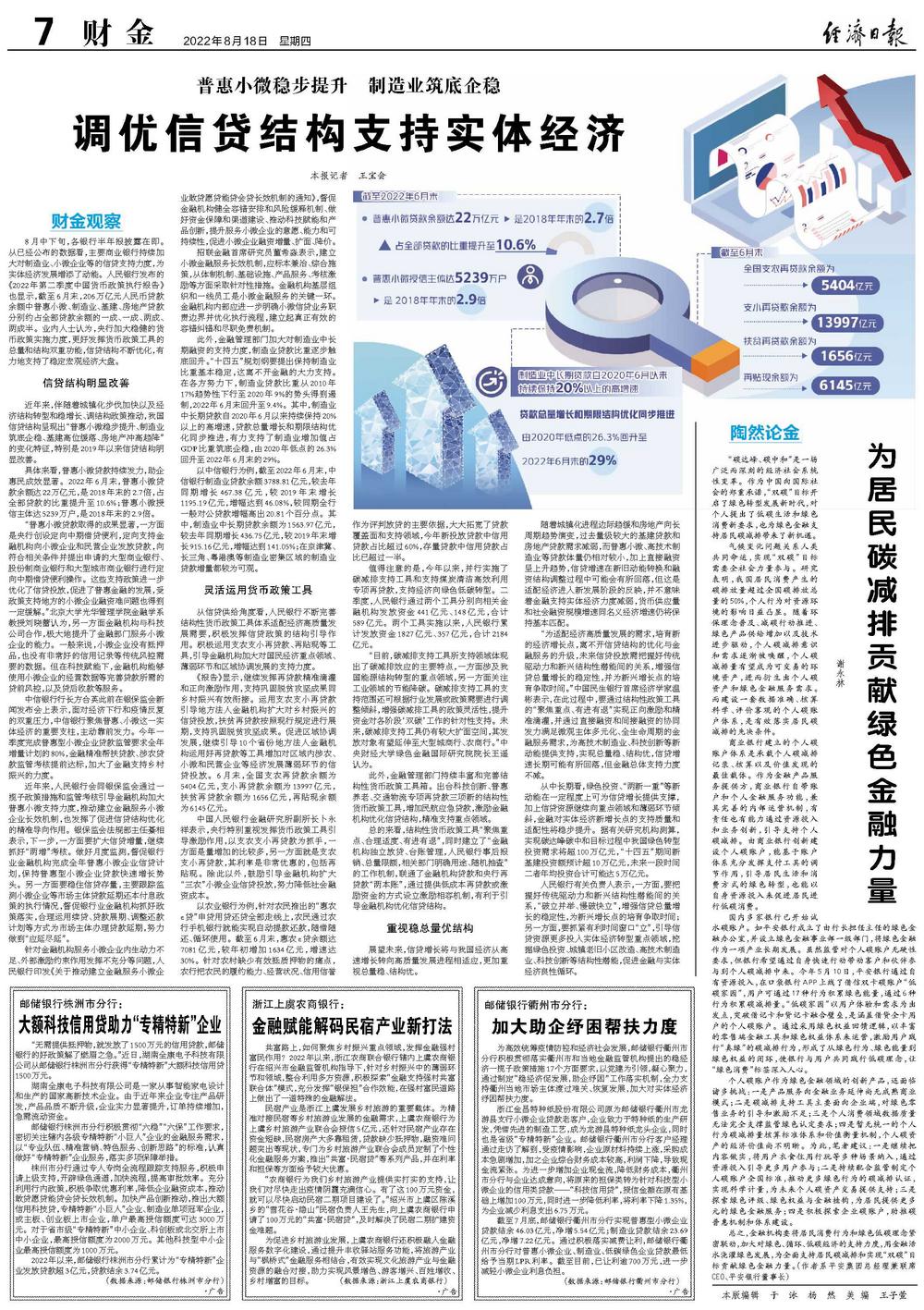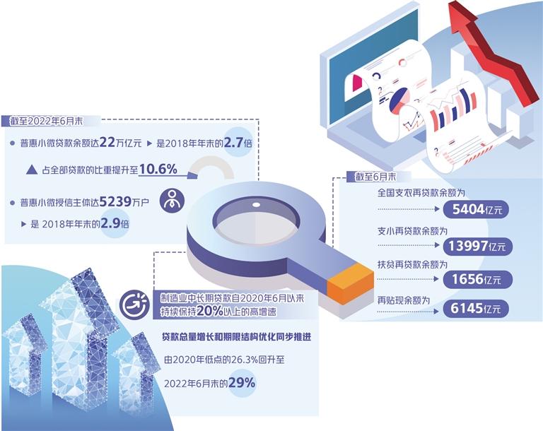 8月中下旬,各银行半年报披露在即。从已经公布的数据看,主要商业银行持续加大对制造业、小微企业等的信贷支持力度,为实体经济发展增添了动能。人民银行发布的《2022年第二季度中国货币政策执行报告》也显示,截至6月末,206万亿元人民币贷款余额中普惠小微、制造业、基建、房地产贷款分别约占全部贷款余额的一成、一成、两成、两成半。业内人士认为,央行加大稳健的货币政策实施力度,更好发挥货币政策工具的总量和结构双重功能,信贷结构不断优化,有力地支持了稳定宏观经济大盘。