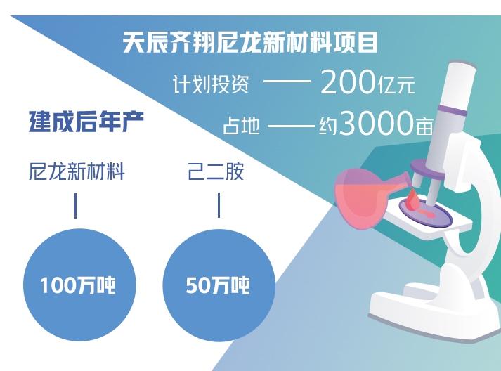 据柴永峰介绍,面对市场对己二腈材料的强劲需求,中国化学工程集团投资建设的天辰齐翔尼龙新材料项目2020年5月在山东淄博开工。项目分为两期建设,计划投资200亿元,占地约3000亩,建成后年产100万吨尼龙新材料、50万吨己二胺、50万吨己二腈等。其中,项目一期占地1800亩,年可生产20万吨己二腈及丙烯腈、尼龙66成盐及切片等产品。