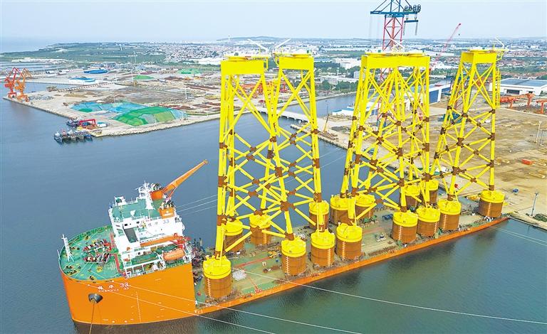 8月18日,一批用于海上风电的吸力筒式导管架在山东烟台一家海工装备企业装船完毕,准备发运出口。近年来,烟台积极打造海工装备自主创新集成基地,形成了海工装备制造及配套企业集群,相关产品远销30多个国家和地区。唐 克摄(中经视觉)