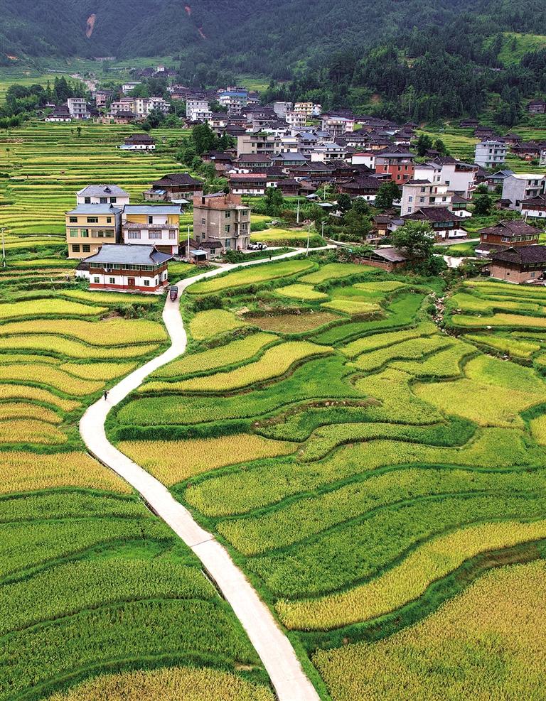 8月21日,俯瞰贵州省黔东南州从江县刚边壮族乡高麻村的梯田景色。时下,刚边壮族乡高麻梯田水稻进入成熟期,金黄的田野与村居构成一幅美丽景象。石宏辉摄(中经视觉)