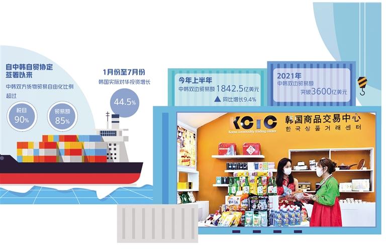 建交30年来,中韩互为重要贸易伙伴。两国年贸易额从建交初期不到50亿美元迅速增长到超过3000亿美元,中韩贸易实现了跨越式发展。肆虐全球的新冠肺炎疫情也没能阻止中韩经贸合作发展的步伐,双边贸易额在疫情中逆势上扬,并在2021年突破3600亿美元,是建交当年的72倍。今年初,《区域全面经济伙伴关系协定》(RCEP)的生效实施,为两国进一步深化经贸合作提供了更为广阔的空间。今年上半年,中韩双边贸易额达1842.5亿美元,同比增长9.4%。在全球经济脆弱复苏的背景下,中韩贸易保持较快增长,充分表明两国经济具有较强的互补性,充分展示了双方经贸合作的韧性和潜力。中国连续多年保持韩国最大贸易伙伴、最大出口市场和最大进口来源国,韩国也连续多年位居中国第三大贸易伙伴国。