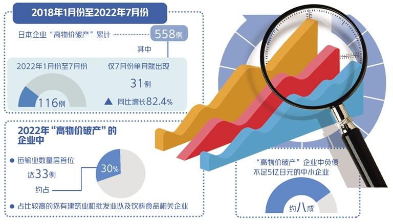 据日本信用调查机构帝国数据银行统计,从2018年1月份至2022年7月份,日本企业“高物价破产”累计558例,其中2022年1月份至7月份达116例,仅7月份单月就出现31例,同比增长82.4%。帝国数据银行预测,8月份相关数据可能再创新高。“高物价破产”已经成为日本政府和企业面临的重要课题。