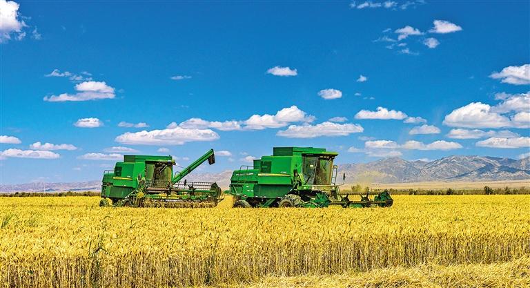 8月29日,收割机在新疆生产建设兵团第十三师红山农场三连麦田里作业。时下,十三师红山农场7.4万亩小麦陆续开镰收割,预计总产量可达3.7万吨。王传生摄(中经视觉)