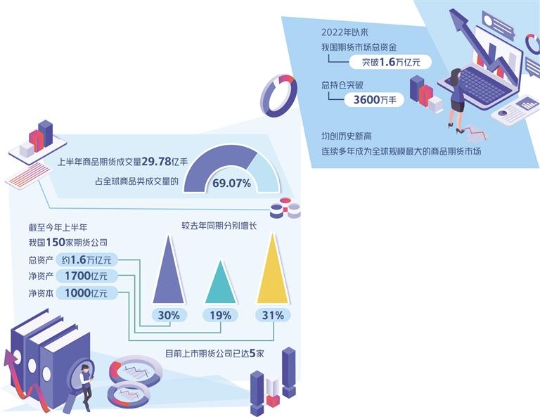 从行业整体看,2022年以来,我国期货市场总资金突破1.6万亿元,总持仓突破3600万手,均创历史新高。上半年商品期货成交量29.78亿手,占全球商品类成交量的69.07%,我国已连续多年成为全球规模最大的商品期货市场。