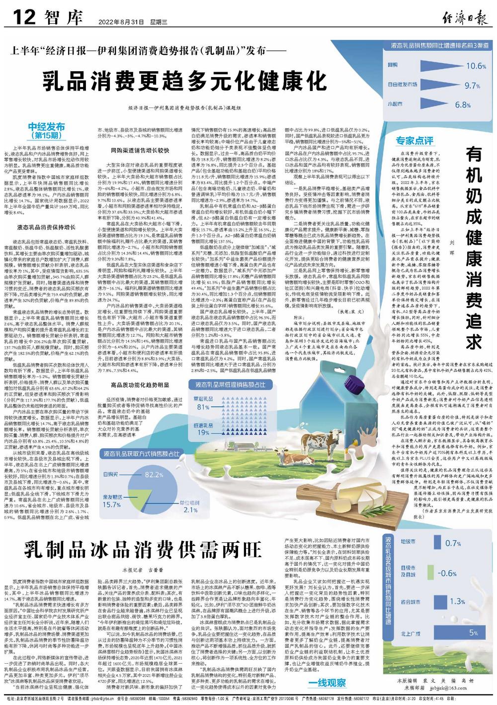 凯度消费者指数中国城市家庭样组数据显示,上半年乳品市场销售总体保持平稳增长,其中,上半年冰品销售额同比增速为14.7%,高于液态乳品销售额同比增速。