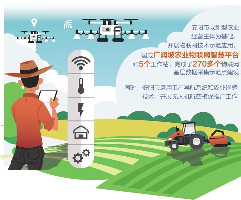 高标准农田配上高科技农机,让种地变得更加轻松。安阳市以新型农业经营主体为基础,运用传感器、摄像头等设备开展物联网技术示范应用,让传统的农业生产方式转变为高产、高效、低耗的智慧农业模式,智能化、便捷化的“互联网+”现代农业生态体系初步建立,建成广润坡农业物联网智慧平台和5个工作站,完成了270多个物联网基层数据采集示范点建设,为安阳市农业生产智能化、集约化、精准化和农产品安全监管奠定了基础。同时,安阳市运用卫星导航系统和农业遥感技术,开展无人机航空植保推广工作。特别是在安阳县瓦店乡、汤阴县优质小麦产业园地块,实现了植保飞防作业全覆盖,不仅节省了人工、药品成本,也避免了农药包装物对农田环境的污染,农田生态环境明显改善,取得了良好的经济效益、社会效益和生态效益。