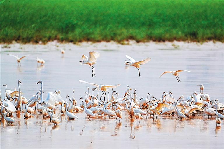 ▼一群白鹭在山西省平陆县黄河湿地翩翩起舞。近年来,当地不断加大黄河流域生态保护力度,湿地生态环境得到改善,给鸟儿提供了安全栖息地。