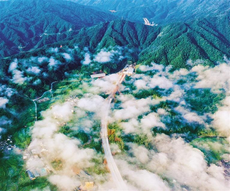 ◀由中国中铁工业旗下中铁九桥参建的祁婺高速A1标段凤山水特大桥全线贯通,如蛟龙腾飞,蜿蜒穿越绿水青山,似玉带缠绕,守护中国最美乡村。