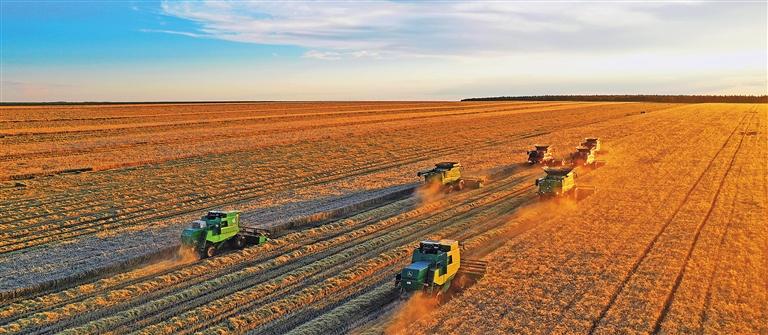 ▲大型机械在内蒙古自治区呼伦贝尔农垦大兴安岭集团公司田间联合收割小麦,确保颗粒归仓。韩 冷摄(中经视觉)