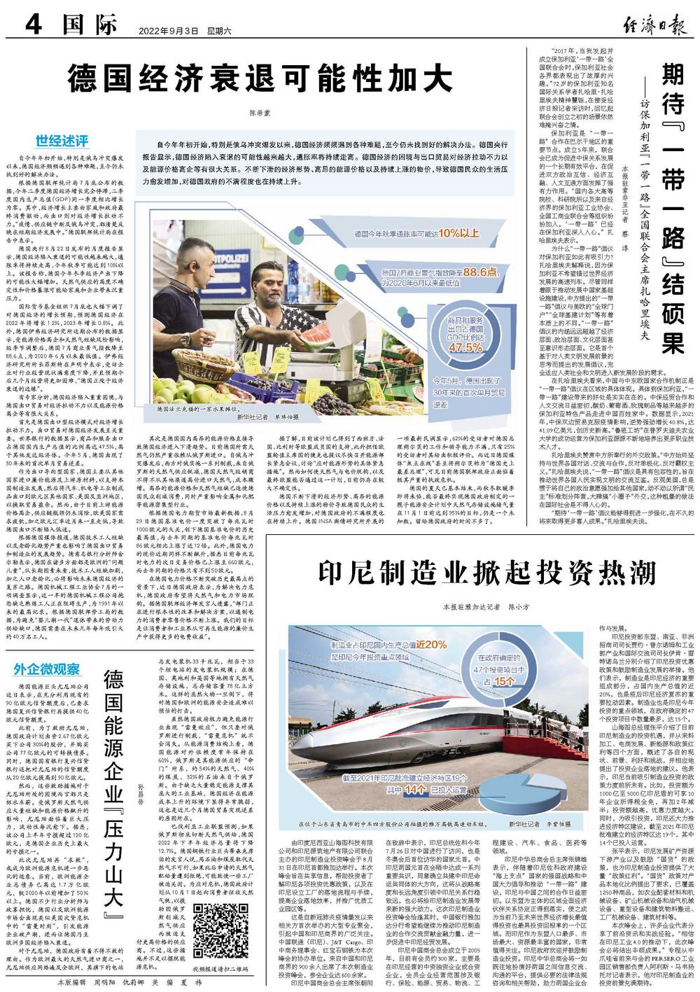 国际货币基金组织7月底也大幅下调了对德国经济的增长预期,预测德国经济在2022年将增长1.2%,2023年增长0.8%。此外,德国伊弗经济研究所近期公布的数据显示,受能源价格高企和天然气短缺风险影响,经季节调整后,德国7月商业景气指数降至88.6点,为2020年6月以来最低值。伊弗经济研究所所长菲斯特在声明中表示,受访企业对行业经营现状满意度下降,并且预期今后几个月经营将更加困难,“德国正处于经济衰退的边缘”。