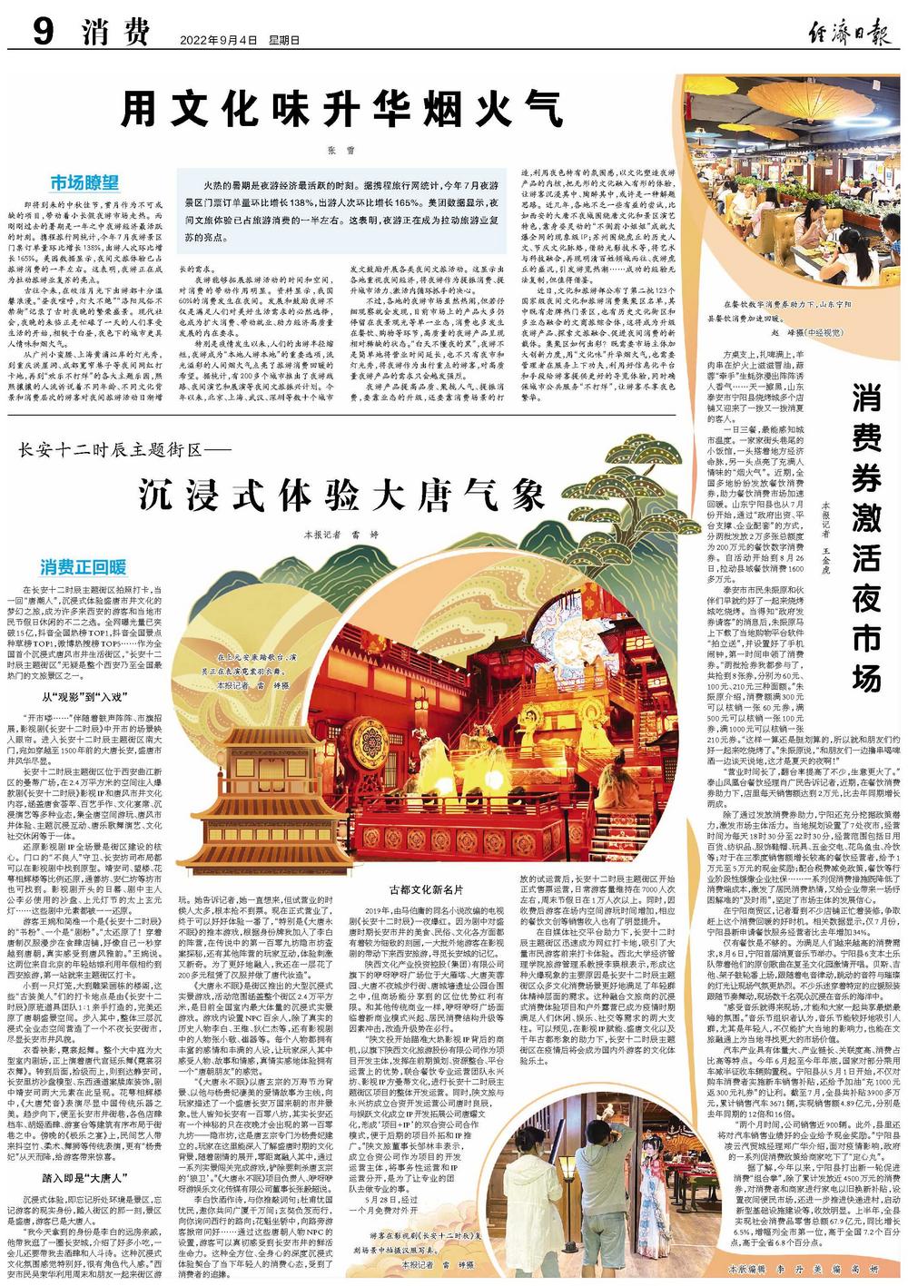 在自媒体社交平台助力下,长安十二时辰主题街区迅速成为网红打卡地,吸引了大量市民游客前来打卡体验。西北大学经济管理学院旅游管理系教授李瑛根表示,形成这种火爆现象的主要原因是长安十二时辰主题街区众多文化消费场景更好地满足了年轻群体精神层面的需求。这种融合文旅商的沉浸式消费体验项目和户外露营已成为疫情时期满足人们休闲、娱乐、社交等需求的两大支柱。可以预见,在影视IP赋能、盛唐文化以及千年古都形象的助力下,长安十二时辰主题街区在疫情后将会成为国内外游客的文化体验乐土。