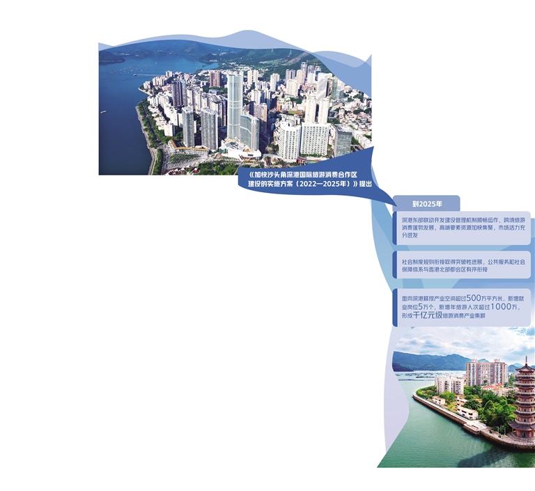 8月23日,盐田区人民政府发布《加快沙头角深港国际旅游消费合作区建设的实施方案(2022—2025年)》,提出30项重点工作任务,将合作区打造成为国际跨境旅游首选目的地、国际消费中心城市特色引领区、深港共建共治融合发展新典范。到2025年,深港东部联动开发建设管理机制顺畅运作,跨境旅游消费蓬勃发展,高端要素资源加快集聚,市场活力充分迸发,社会制度规则衔接取得突破性进展,公共服务和社会保障体系与香港北部都会区有序衔接,面向深港释放产业空间超过500万平方米,新增就业岗位5万个,新增年旅游人次超过1000万,形成千亿元级旅游消费产业集群。