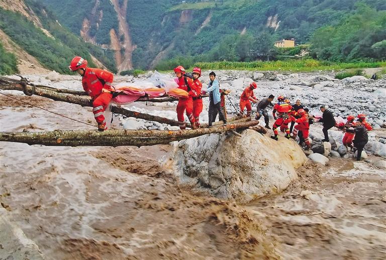 9月5日12时52分,四川省甘孜州泸定县发生6.8级地震,造成重大人员伤亡。鉴于灾情严重,国务院抗震救灾指挥部办公室、应急管理部将国家地震应急响应级别提升至二级。四川省、甘孜州已组织救援力量开展救灾工作,并紧急调拨帐篷、棉被、折叠床等救灾物资运抵灾区。抗震救灾各项工作正紧张有序展开。图为武警四川总队机动第二支队官兵在泸定县磨西镇磨子沟村搭建临时木桥转移被困群众。洪福乐摄(新华社发)