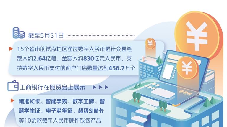 产品创新提速、使用场景拓宽,数字人民币试点正稳步推进。截至5月31日,15个省市的试点地区通过数字人民币累计交易笔数大约2.64亿笔,金额大约830亿元人民币,支持数字人民币支付的商户门店数量达到456.7万个。