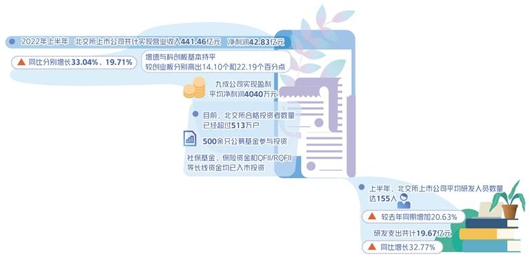 2022年上半年,北交所上市公司克服多重不利因素影响,共计实现营业收入441.46亿元,净利润42.83亿元,同比分别增长33.04%、19.71%,增速与科创板基本持平,较创业板分别高出14.10个和22.19个百分点。九成公司实现盈利,平均净利润4040万元。