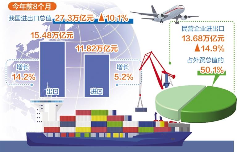 民营企业出口表现突出,是当前我国外贸的一大亮点。数据显示,前8个月,民营企业进出口13.68万亿元,增长14.9%,占我国外贸总值的50.1%,比去年同期提升2.1个百分点。其中,出口9.3万亿元,增长20.2%,占出口总值的60%。商务部研究院研究员徐德顺认为,随着稳增长一揽子政策组合效应的释放,有望进一步推进外贸保稳提质,激发出更多外贸市场主体的活力。