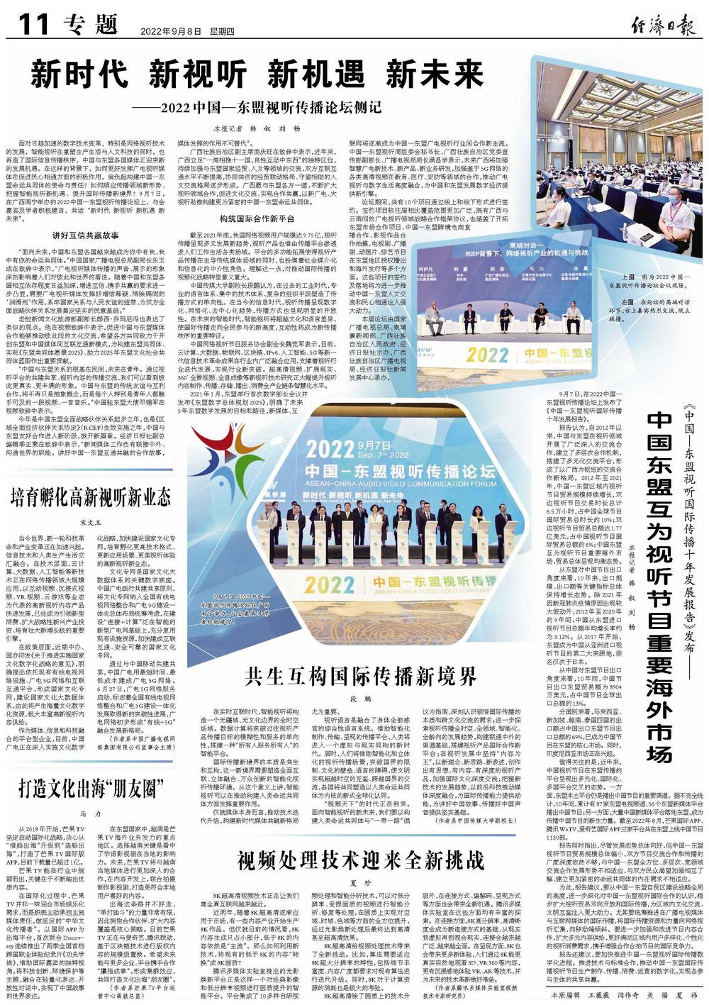 2021年1月,东盟举行首次数字部长会议并发布《东盟数字总体规划2025》,明确了未来5年东盟数字发展的目标和路径,新媒体、互联网将逐渐成为中国—东盟广电视听行业间合作新主流。中国—东盟视听周组委会秘书长,广西壮族自治区党委宣传部副部长、广播电视局局长满昌学表示,未来广西将加强智慧广电新技术、新产品、新业务研发,加强基于5G网络的各类高清视频在教育、医疗、安防等领域的合作,推动广电视听与数字生活高度融合,为中国和东盟发展数字经济提供新引擎。