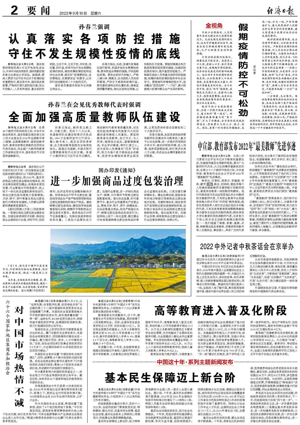 教育部门完善教育优先发展机制,国家财政性教育经费投入占GDP比例连续10年保持在4%以上。大力推进“双减”,教育生态正在重塑。教育评价、考试招生等改革持续深化,依法治教更加有力。此外,全国义务教育阶段教师平均工资收入水平不低于当地公务员基本实现。