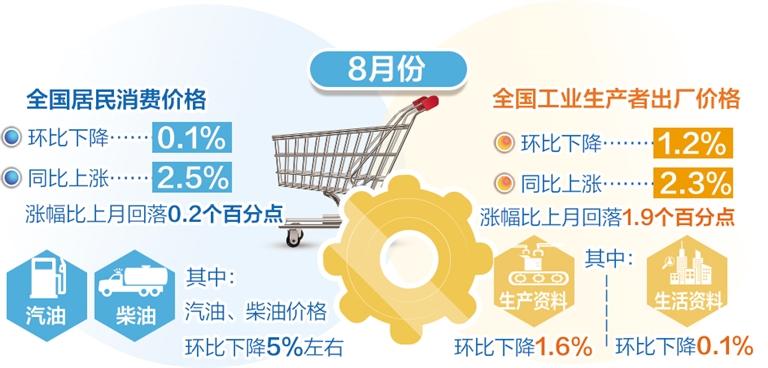 9月9日,国家统计局发布8月份全国居民消费价格指数(CPI)和工业生产者出厂价格指数(PPI)。数据显示,8月份,CPI同比上涨2.5%,环比下降0.1%。PPI同比上涨2.3%,连续10个月回落;环比下降1.2%。