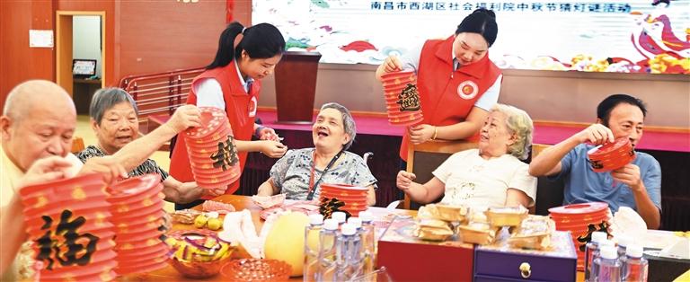 ◀9月9日,江西省南昌市西湖区社会福利院开展“福满中秋 乐在其中”活动,党员志愿者与老人共度佳节,让老人感受浓浓温情。