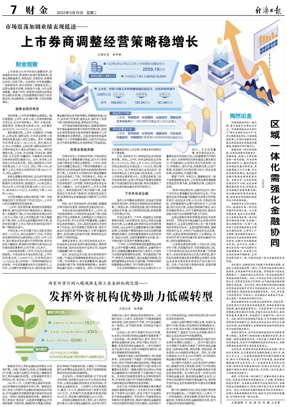 上市券商2022年半年报已披露完毕,受地缘政治冲突、新冠肺炎疫情反复等影响,券商业绩普遍承压,券商经纪、自营投资、资管等业务收入出现下降。与此同时,半年报透露出一些积极信号,部分券商在二季度承压而上,经营业绩逐步改善,实现扭亏为盈,为行业带来暖意。展望下半年,券商表示将抓住宏观经济企稳回升机遇,立足财富管理市场巨大的发展空间,形成新特色,打造新引擎,力争实现新增长。