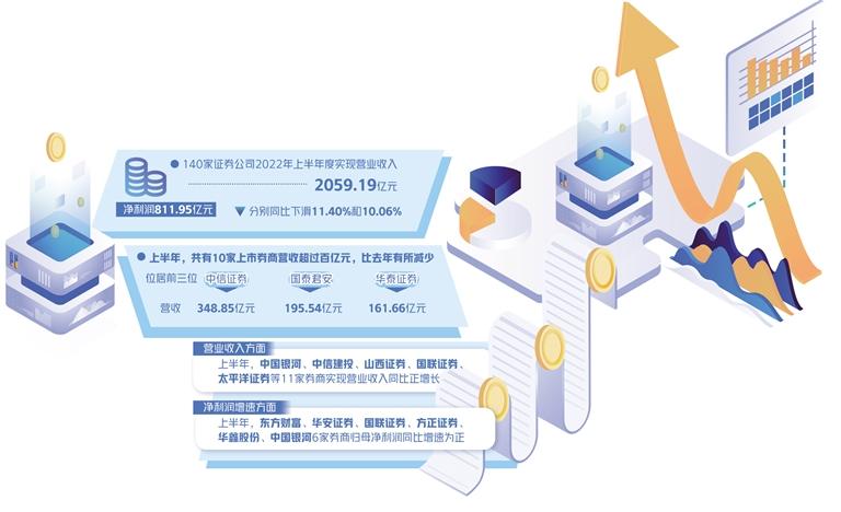 券商业绩整体表现低迷,在此前中国证券业协会发布的证券公司2022年上半年度经营数据中已有所体现,数据显示,140家证券公司2022年上半年度实现营业收入2059.19亿元,净利润811.95亿元,分别同比下滑11.40%和10.06%。