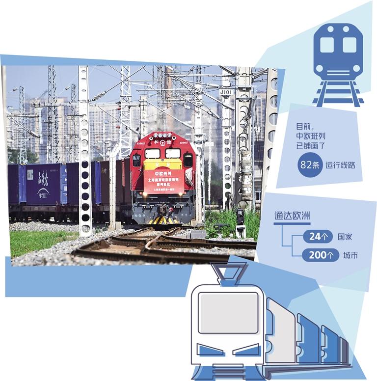 目前,中欧班列已铺画了82条运行线路,通达欧洲24个国家200个城市,逐步“连点成线”“织线成网”,运输服务网络覆盖欧洲全境,运输货物品类涉及衣服鞋帽、汽车及配件、粮食、木材等53大门类5万多种品类。