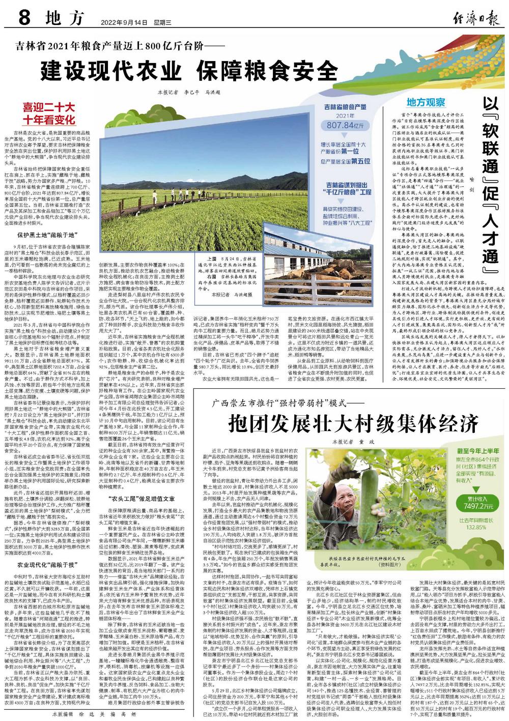 吉林省始终把保障国家粮食安全重任扛在肩上、抓在手上,实施“藏粮于地、藏粮于技”战略,努力为国家多产粮、产好粮。10年来,吉林省粮食产量连续跨上700亿斤、800亿斤台阶,2021年达到807.84亿斤,增长率居全国前十大产粮省份第一位,总产量居全国第五位。当前,吉林省正瞄准打造“农产品及其深加工和食品细加工”等三个万亿元级产业目标,争当现代农业建设排头兵,全面推进乡村振兴。