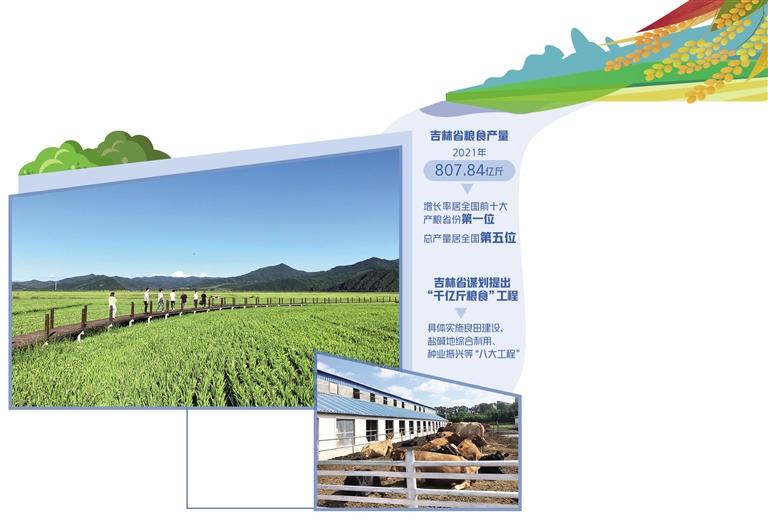 吉林省省长韩俊介绍,为了在更高层次上保障国家粮食安全,吉林省谋划提出了“千亿斤粮食”工程,具体实施良田建设、盐碱地综合利用、种业振兴等“八大工程”,力争到2030年粮食产量突破1000亿斤。