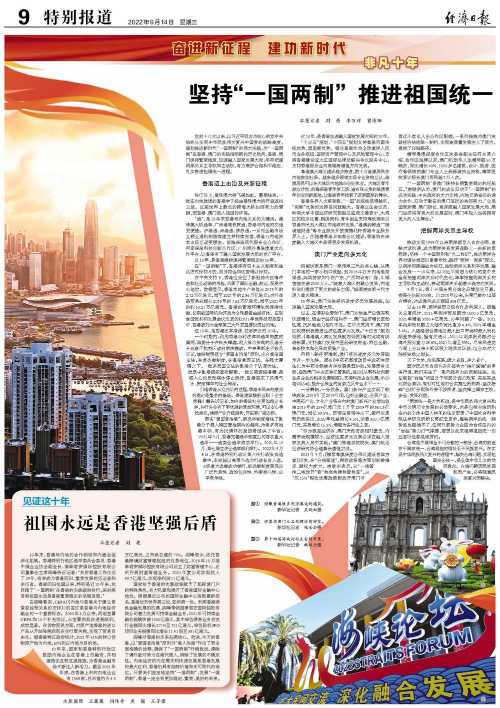 在中央支持下,香港经受住了新冠肺炎疫情冲击和社会动荡的考验,巩固了国际金融、航运、贸易中心地位。数据显示,香港本地生产总值从2013年的2.12万亿港元,增至2021年的2.86万亿港元;对外商品贸易总额从2013年的7.62万亿港元,增至2021年的约10.27万亿港元。香港的营商环境依然保持优越,长期被国际机构评选为全球最自由经济体。在联合国贸易和发展会议发表的《2021年世界投资报告》中,香港被列为全球第三大外来直接投资目的地。