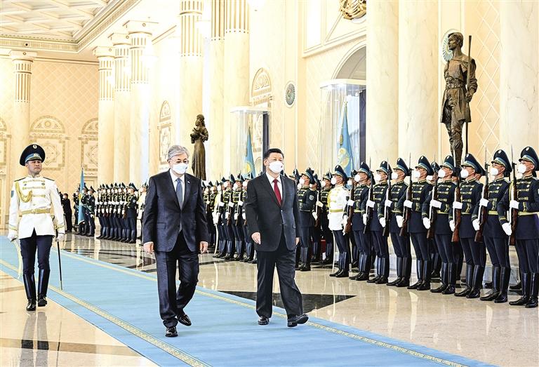 托卡耶夫为习近平举行隆重欢迎仪式。两国元首共同登上检阅台,军乐团奏中哈两国国歌。习近平在托卡耶夫陪同下检阅仪仗队。
