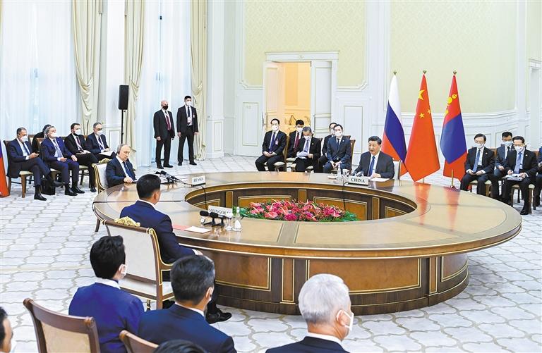 本报乌兹别克斯坦撒马尔罕9月15日讯(记者赖毅)当地时间15日下午,国家主席习近平在撒马尔罕国宾馆同俄罗斯总统普京、蒙古国总统呼日勒苏赫举行中俄蒙三国元首第六次会晤。