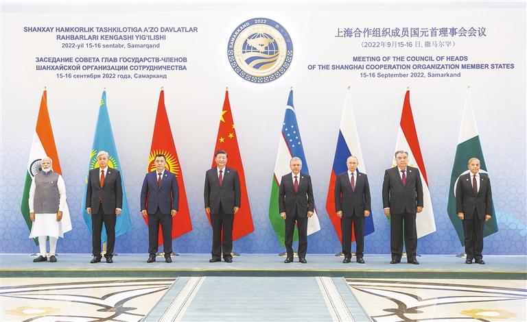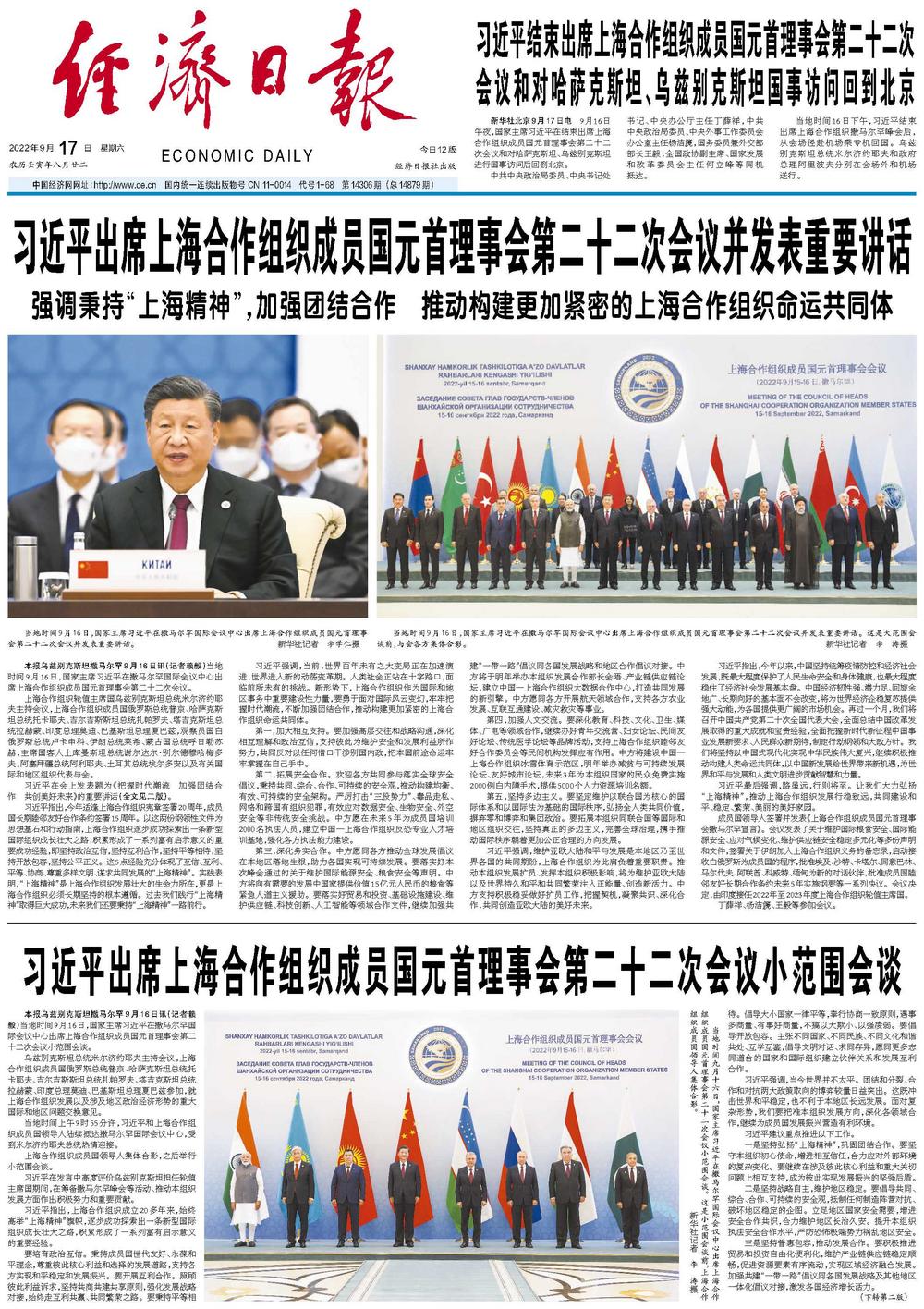 习近平强调,中国共产党即将召开第二十次全国代表大会,全面擘画下一个阶段中国发展蓝图。无论国际形势如何变化,中方将始终坚持和平发展、开放发展、合作发展、共同发展,视上海合作组织为外交优先方向,愿以自身发展助力地区国家发展,为各国人民创造更多福祉。
