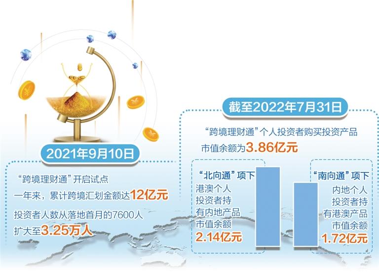 据了解,“跨境理财通”落地以来一直保持较高热度,呈现出试点银行多、参与主体广、业务量适中、产品范围宽等特点。从今年6月的监管数据看,粤港澳大湾区参与“跨境理财通”的个人投资者新增1662人,其中,港澳地区新增1303人参与“北向通”,内地新增359人参与“南向通”。截至2022年6月30日,粤港澳大湾区参与“跨境理财通”个人投资者合计30851人,包括港澳投资者20906人,内地投资者9945人。