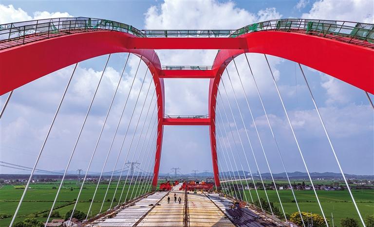 9月17日,安徽省合肥市庐江县盛桥镇境内的无(为)岳(西)高速兆河特大桥施工现场,建设者坚守岗位确保施工进度。兆河特大桥是沪武高速无为市至岳西县段的重要节点工程。大桥全长2402米,建成后将促进区域经济发展。