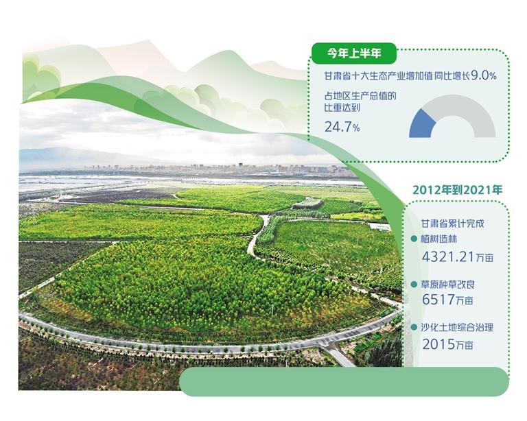 近年来,陇原大地生态环境发生显著变化,呈现出生态破坏点位有效修复、绿色发展支撑不断强化、生态文明建设进程逐步加快的良好态势。2021年,全省空气质量平均优良天数比例达90.2%,地表水国考断面水质优良比例达95.9%。今年上半年,甘肃全省十大生态产业增加值同比增长9.0%,占地区生产总值的比重达到24.7%。