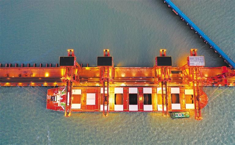 9月20日,浙江省宁波舟山港穿山港区中宅矿石码头,装载着17.8万吨澳大利亚铁矿砂的“宏梅”轮在忙碌作业,这是宁波市最大也是该市唯一一座30万吨级矿石码头正式投产后迎来的第一艘船舶。蒋晓东摄(中经视觉)