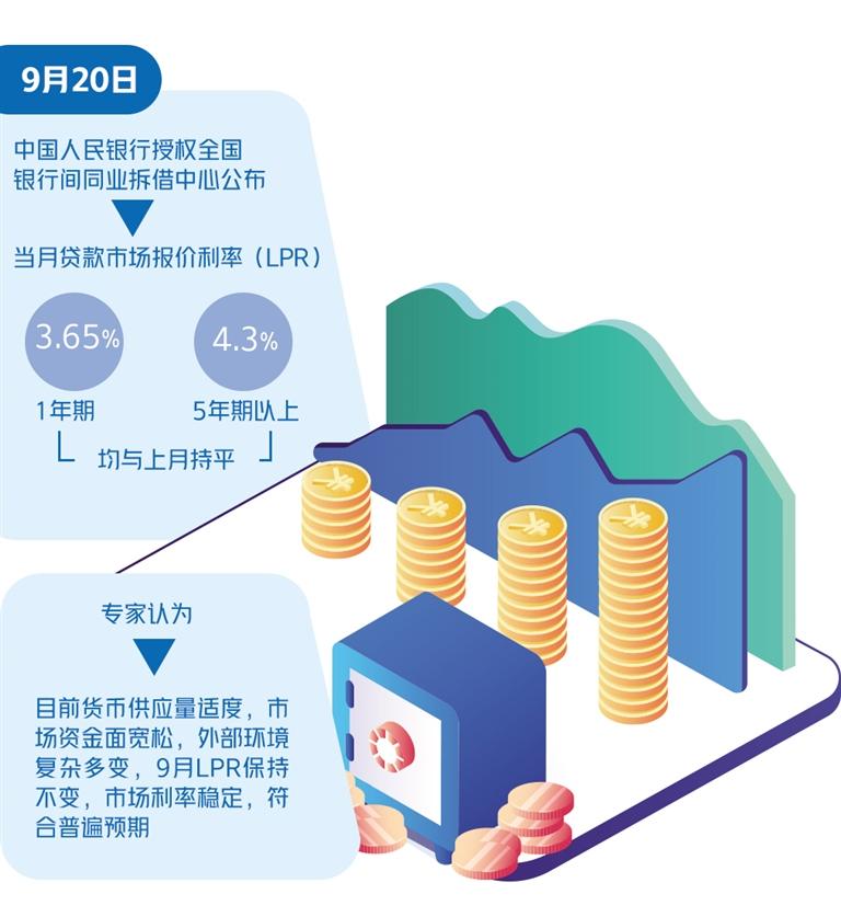 9月20日,中国人民银行授权全国银行间同业拆借中心公布,当月贷款市场报价利率(LPR):1年期LPR为3.65%,5年期以上LPR为4.3%,均与上月持平。专家认为,目前货币供应量适度,市场资金面宽松,外部环境复杂多变,9月LPR保持不变,市场利率稳定,符合普遍预期。