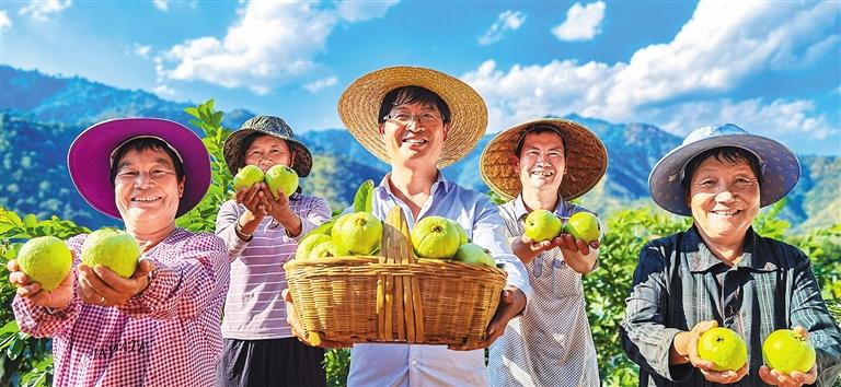 果农在攀枝花市米易县撒莲镇展示丰收的水果芭乐。一年四季瓜果飘香的攀枝花市通过打造农产品区域公用品牌“攀果”,推动当地水果产业快速发展。吴植根摄(中经视觉)