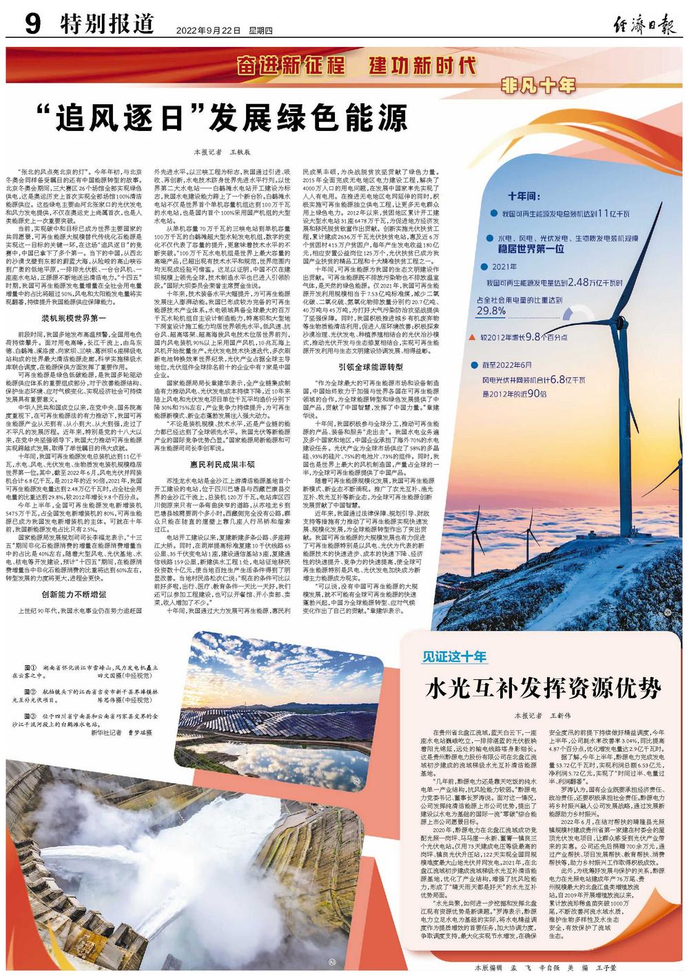 十年来,技术装备水平大幅提升,为可再生能源发展注入澎湃动能。我国已形成较为完备的可再生能源技术产业体系。水电领域具备全球最大的百万千瓦水轮机组自主设计制造能力,特高坝和大型地下洞室设计施工能力均居世界领先水平。低风速、抗台风、超高塔架、超高海拔风电技术位居世界前列,国内风电装机90%以上采用国产风机,10兆瓦海上风机开始批量生产。光伏发电技术快速迭代,多次刷新电池转换效率世界纪录,光伏产业占据全球主导地位,光伏组件全球排名前十的企业中有7家是中国企业。