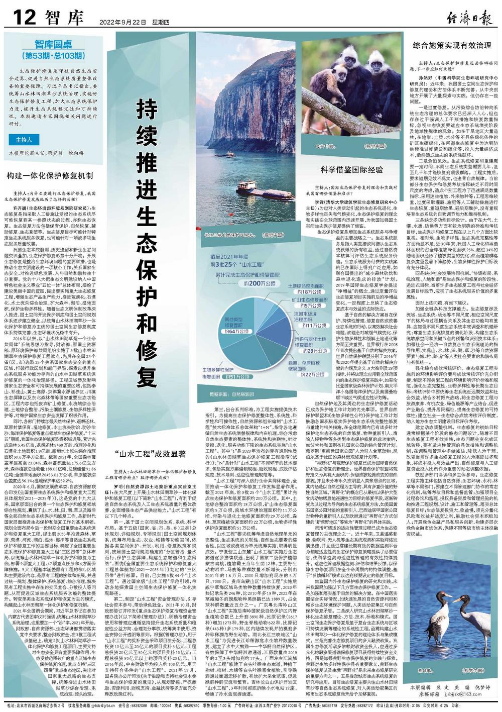生态保护修复是守住自然生态安全边界、促进自然生态系统质量整体改善的重要保障。习近平总书记指出,要统筹山水林田湖草沙系统治理,实施好生态保护修复工程,加大生态系统保护力度,提升生态系统稳定性和可持续性。本期邀请专家围绕相关问题进行研讨。