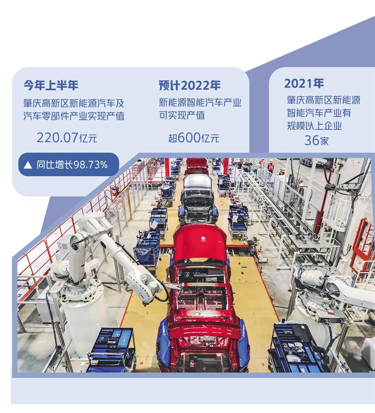 安道拓公司的持续发展壮大,是肇庆高新区新能源智能汽车产业产销两旺的生动写照,更是这里新能源汽车产业聚集、集群化发展的新趋势。随着小鹏汽车、宁德时代等龙头链主企业陆续投产,肇庆高新区新能源汽车产业发展后劲更足,产值节节攀升。2021年,全区新能源智能汽车产业有规模以上企业36家,全年实现产值312亿元,同比增长66%;今年上半年,全区新能源汽车及汽车零部件产业实现产值220.07亿元,同比增长98.73%,预计2022年新能源智能汽车产业可实现产值超600亿元。