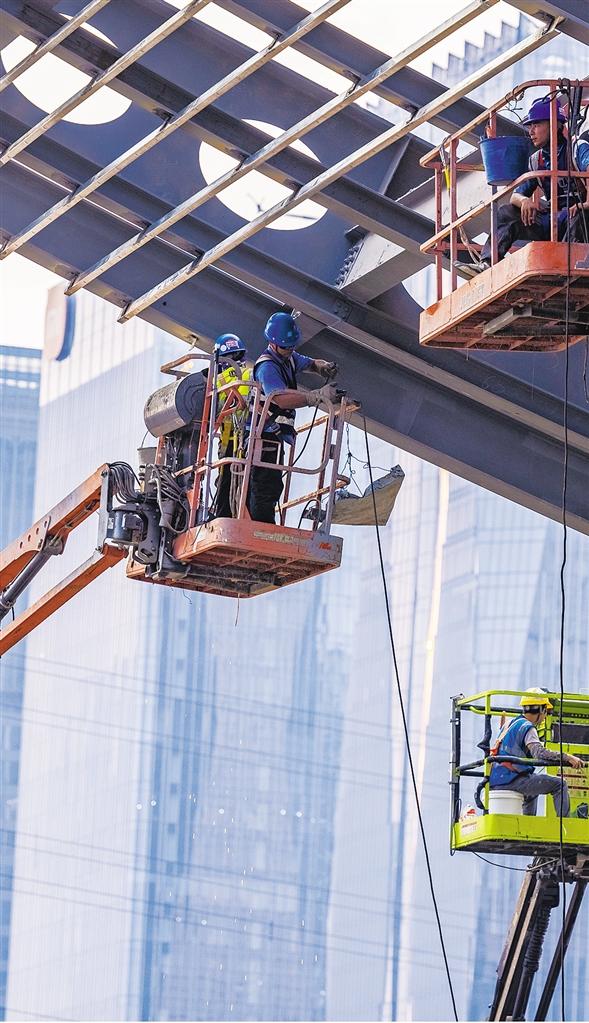 九月二十三日,广州市海珠区广交会展馆四期项目现场,建设者正进行金属屋面龙骨焊接作业。项目预计于第一百三十二届广交会开幕前交付使用,为国内外展商提供更大展示平台。付海燕摄(中经视觉)