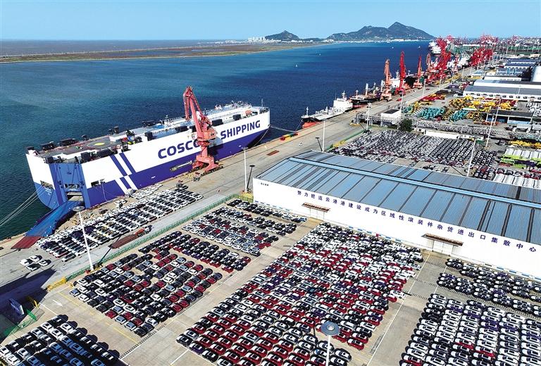 近日,一艘滚装船靠泊在江苏连云港港东方公司泊位,准备装运汽车。今年以来,连云港港车辆出口呈现走强态势。据统计,1月至8月出口车辆12.4万台,同比增长30.89%。王 春摄(中经视觉)