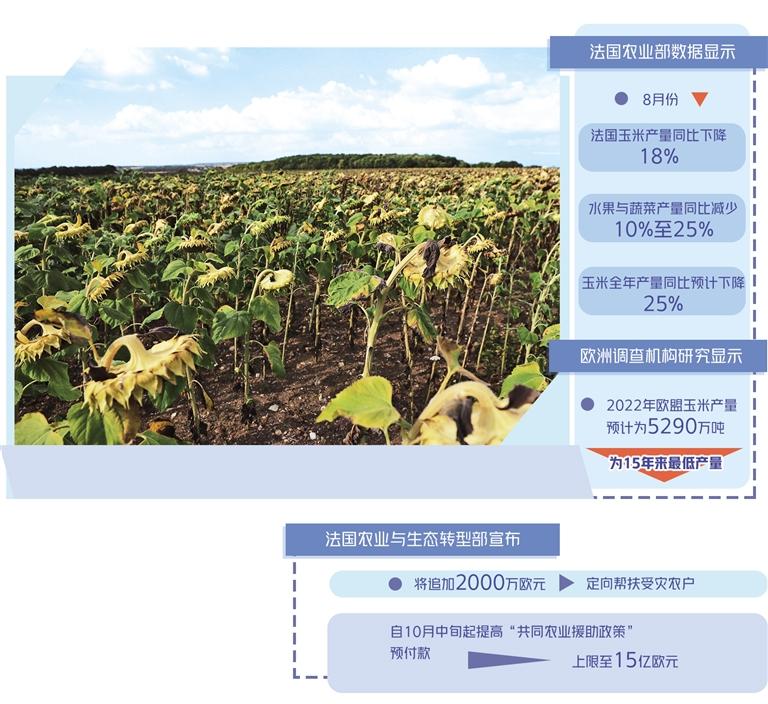 一是直接冲击粮食收成。法国农业部统计数据显示,在农产品领域,法国今年8月份玉米产量同比下降18%,全年产量同比预计下降25%,为1990年以来的最低水平,水果与蔬菜产量减少10%至25%。法国蒙彼利埃国家农艺研究所研究室主任弗朗索瓦·塔迪尼指出:“虽然各农业部门的情况不尽相同,但干旱带来的整体冲击已不可避免。”尤其今夏以来,小麦、大麦、油菜等平均收成偏低,如小麦收成不足3340万吨。作为世界主要小麦出口国,法国的减产也将对国际小麦市场造成外溢影响。法国农业原材料市场专家塞巴斯蒂安·彭瑟莱指出:“对于春季播种的夏季作物,如玉米、向日葵等,干旱的影响将更为巨大,甚至是灾难性的。”